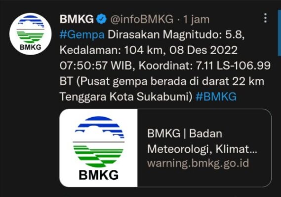 Medianesi.id – Badan Meteorologi, Klimatologi dan Geofisika (BMKG) menyatakan telah terjadi gempa bumi dengan kekuatan 5,8 magnitudi di wilayah Sukabumi, Jawa Barat, Kamis (08/12/2022) pagi.