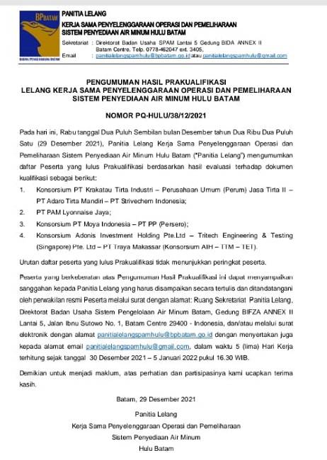Dalam pengumuman bernomor PQ-Hulu/38/12/2021 tertanggal 29 Desember 2021, panitia lelang mengumumkan nama-nama peserta yang lulus Prakualifikasi berdasarkan hasil evaluasi terhadap dokumen