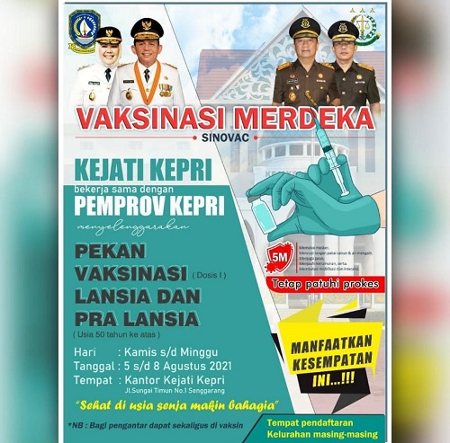Kegiatan yang dilaksanakan Kejati Kepri bekerjasama dengan Pemerintah Provinsi untuk mengadakan pekan vaksinasi lansia dan pra lansia.