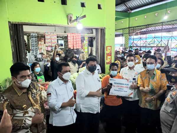 Selain meninjau harga pangan, Airlangga juga memberikan bantuan KUR kepada para pedagang yang merupakan program dari Bank BNI wilayah Tanjungpinang. Besaran bantuan KUR yang diberikan kepada pedagang adalah sebesar Rp 100 juta.