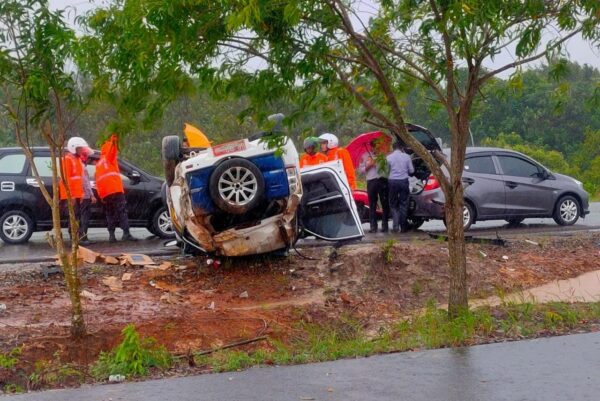 “Ada genangan air, lalu dilakukan pengereman. Namun yang terjadi mobil mengalami slip dan hilang kendali hingga berguling kekanan dan posisi akhir mobil tersebut ialah bagian roda berada di atas,” katanya.
