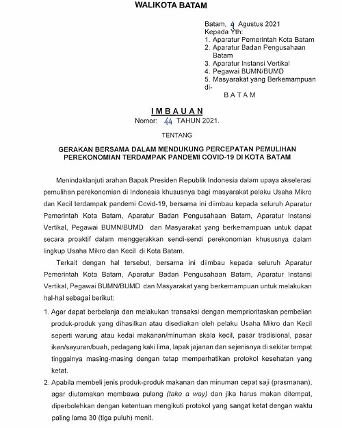 Rudi berharap imbauan ini agar dapat dipahami dan dilaksanakan dengan penuh rasa tanggung jawab untuk membantu pemulihan perekonomian khususnya pada sektor UMKM yang ada di Kota Batam.