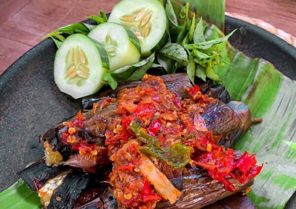 Nikmati terong bakar sambal santan beserta nasi hangat dan tambahkan juga kerupuk sebagai pelengkap.
