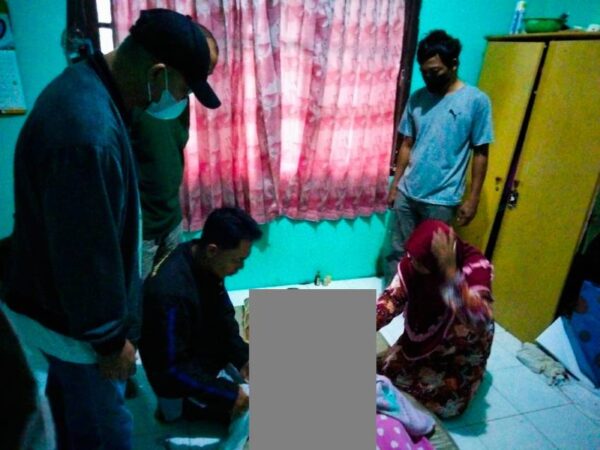 Mm ditemukan anak keduanya dalam posisi tergantung menggunakan tali nilon pada kusen pintu kamarnya.