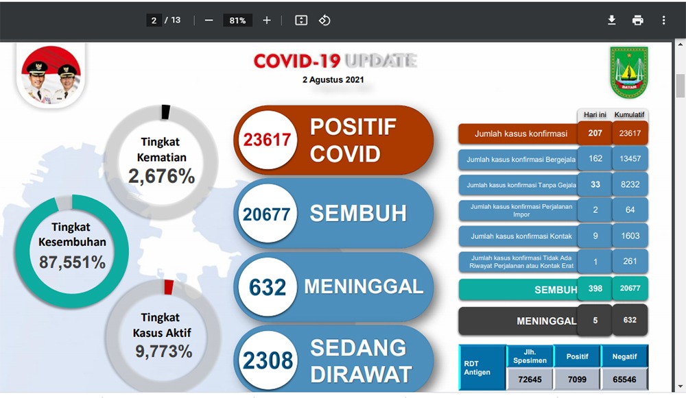 “Sebanyak 2.308 orang sedang dirawat,” demikian laporan Satgas COVID-19 Batam.