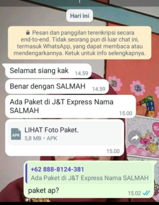 Pasalnya, hal meresahkan ini menghantui seluruh kalangan masyarakat. Pelaku berpura-pura mengaku dari jasa ekspedisi dan mengirimkan file dnegan ekstensi APK. Jika yang membuka tidak jeli dan hanya melihat judul file saja, akan terkecoh untuk membuka link dan mengunduh file tersebut.